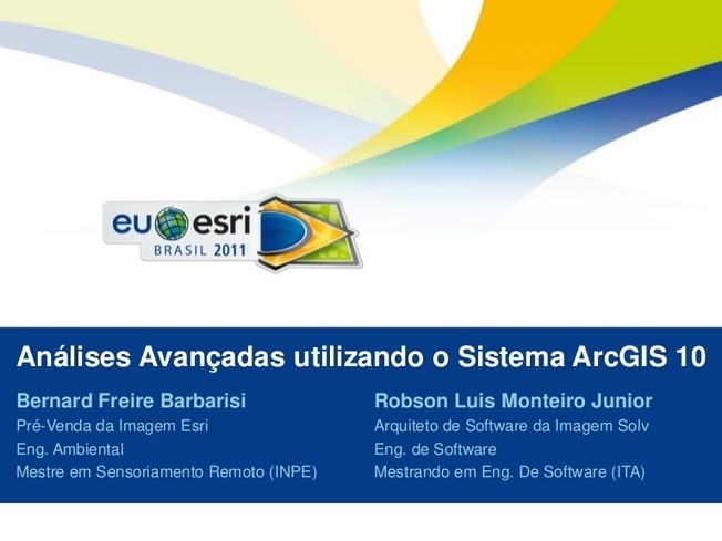Seu logo aqui!Análises Avançadas utilizando o Sistema ArcGIS 10Bernard Freire Barbarisi Robson Luis Monteiro JuniorPré-Venda da Imagem Esri